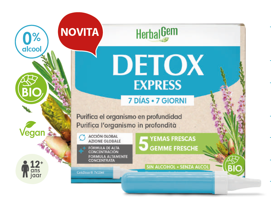HerbalGem Detox Express 7 Monodose è un integratore alimentare a base di gemme fresche di betulla, rosmarino, castagno, olmo ed erica, per depurare profondamente l'organismo.