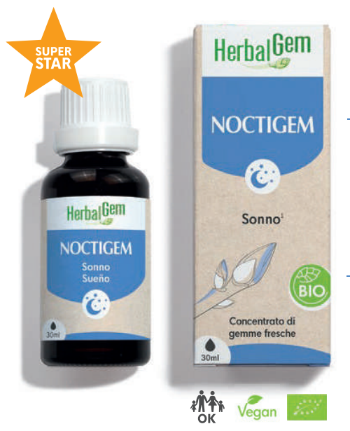 "Noctigem Favorisce l’addormentamento e aumenta la qualità del sonno grazie all’azione di due gemme: la gemma di tiglio che